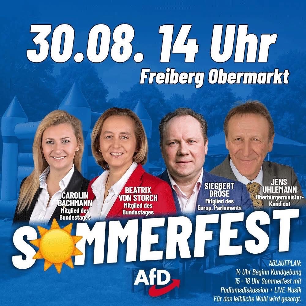 🎤 Mit dabei u.a.: Carolin Bachmann MdB, Beatrix von Storch MdB, Siegbert Droese MdEP, Jens Uhlemann (OB-Kandidat für Freiberg) und viele weitere engagierte Vertreter unserer Volkspartei AfD.