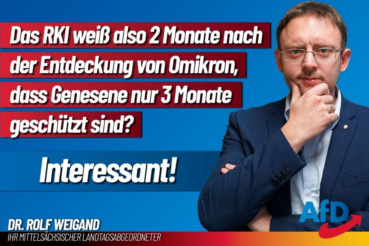 Ich habe gestern umgehend eine Kleine Anfrage an die Sächsische Staatsregierung gerichtet. Ich möchte wissen, wie viele Genesene sich in den letzten Wochen in Sachsen infiziert haben und wie viele davon erst 3 Monate oder kürzer genesen waren. Außerdem: Welche fachlichen Erkenntnisse haben dazu geführt, dass man in Deutschland nun sogar vom digitalen COVID-Zertifikat der EU abweicht, das eine Gültigkeit von 180 Tagen hat? Zu welcher Kommunikation kam es zwischen Sächsischer Staatsregierung und Bundesregierung/RKI bezüglich des Genesenenstatus?