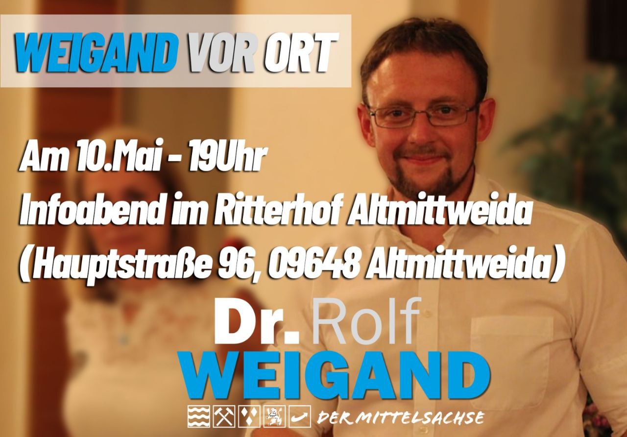 „Gemeinsam mit Ihnen will ich „Ein Haus Mittelsachsen“ bauen. Beim Infoabend am 10.05.2022 möchte ich Ihnen ab 19.00 Uhr im Ritterhof Altmittweida (Hauptstraße 96, 09648 Altmittweida) dieses „Haus Mittelsachsen“ und damit meine Vision für unseren Landkreis vorstellen.“